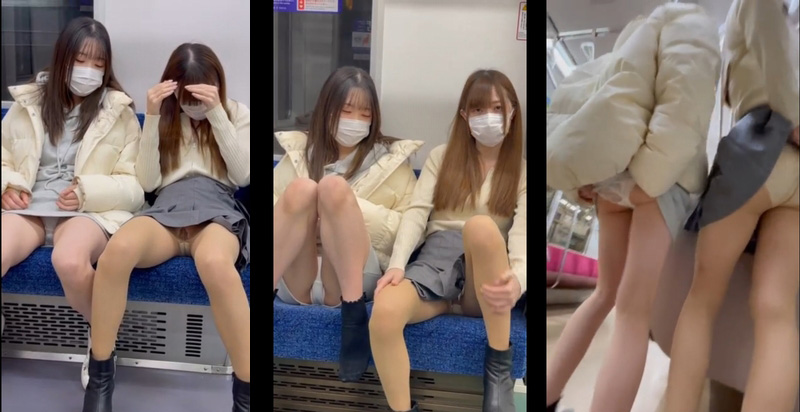 美脚の女子大生2人組が車内で見せつけパンチラ