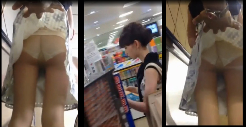 お団子ヘアーのスレンダーな美脚お姉さんをエスカレータでスカートをめくってパンティを盗撮